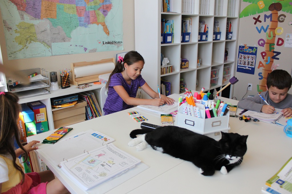 Next the kids colored their state worksheets as I read the facts for that day. The cat likes to be involved, so he makes himself right at home on our new Ikea clad school setup.