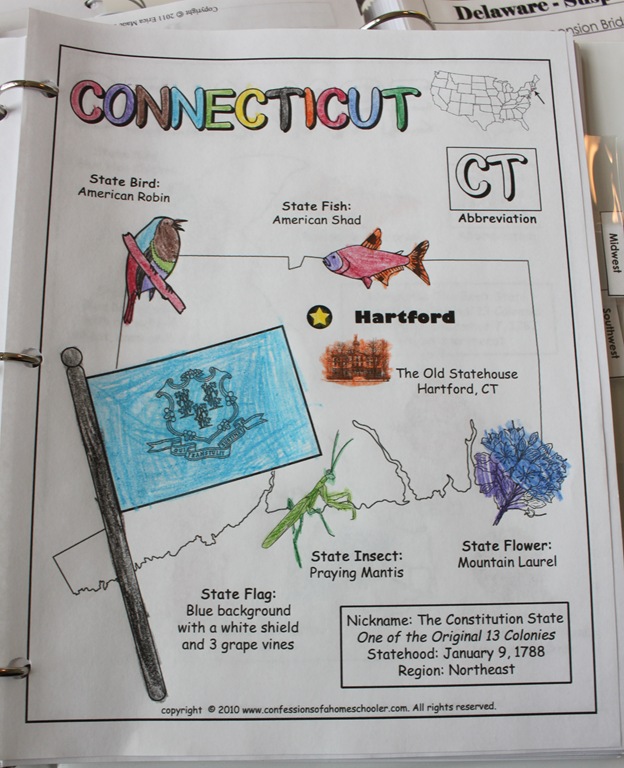 You can either glue them to a divider page (we put a divider between each region of the US, and glued the state books to that. OR you can create a US lapbook, a double lapbook, so two file folders glued together, then put them all in there. It’s totally up to you. Some people prefer to do the divider page since all of the state pages are kept in a binder, but you can do it either way.