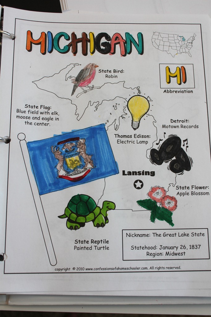 Of course the kids had a chance to color in their state worksheets as we read through all of our information for Michigan.