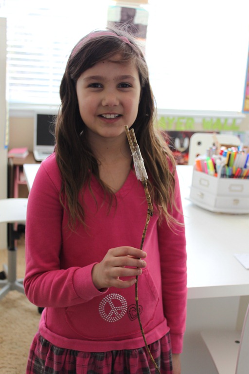 The next invention Strawberry Shortcake made was a back scratcher. I was working a little on emails when I noticed someone measuring my back side. Naturally I was curious, but I got not solid answers, just that she was working on something. After a few more measurements, she disappeared, then returned with this. It’s a backscratcher made from twigs, sticks, and packing tape. The same tape I use to send out Cd’s too all of you! I was quite impressed when I realized that it actually worked pretty well!
