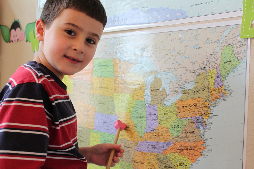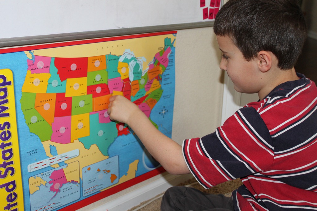 Turbo got to add the state to our Trend USA Wall Poster. (I’ve had a few questions about this. I purchased two of them, then cut out the states from one of them and added velcro dots to them. It’s kind of like a big puzzle that way, and it’s a great way to see the states we’ve learned so far.