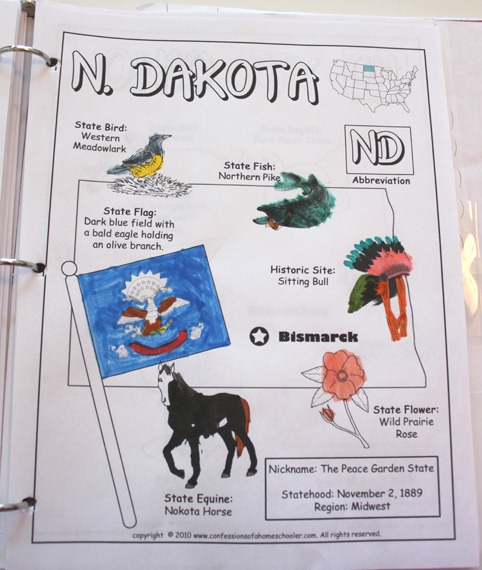 Of course the kids had a chance to color in their state worksheets as we read through all of our information for North Dakota .