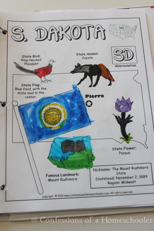 The kids had a chance to color in their state worksheets as we read through all of our information for South Dakota .