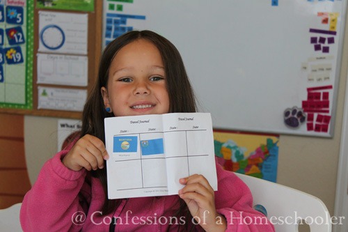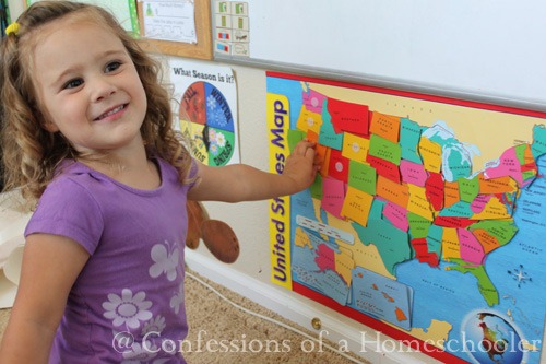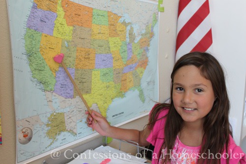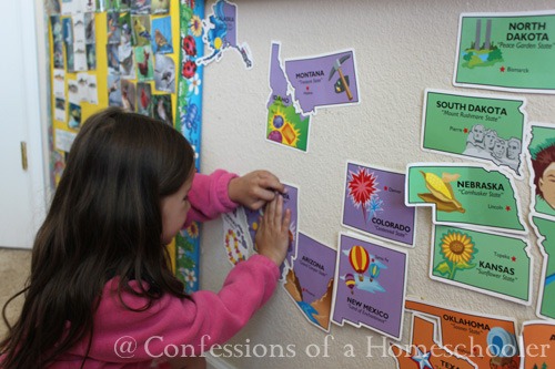 Then Teeny Tot had the honor of adding the state to our wall map. I’ve had lots of questions on this, and the directions are in the curriculum, but we purchased two of these Trend USA Wall Maps and then simply cut one up into states, then used small velcro dots to attach them as we travel through our state study.
