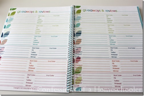This new planner also includes several pages for giveaways & reviews…